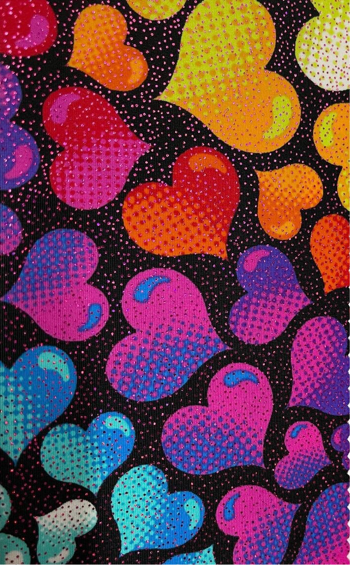 Colorful love heart print on nylon spandex with foil 4-way stretch 58/60”sold by the YD.ships worldwide from Los Angeles California USA.
